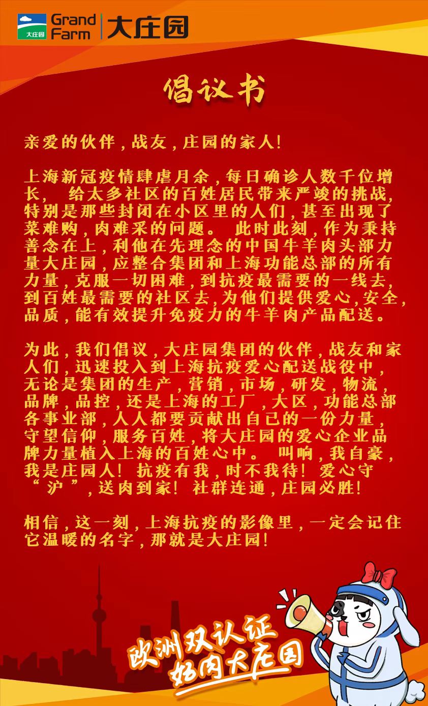 大莊園集團火速成立了“大莊園上海抗疫愛心配送項目組”,并向全集團發(fā)出了“共同守“滬” 莊園有我”的倡議書。